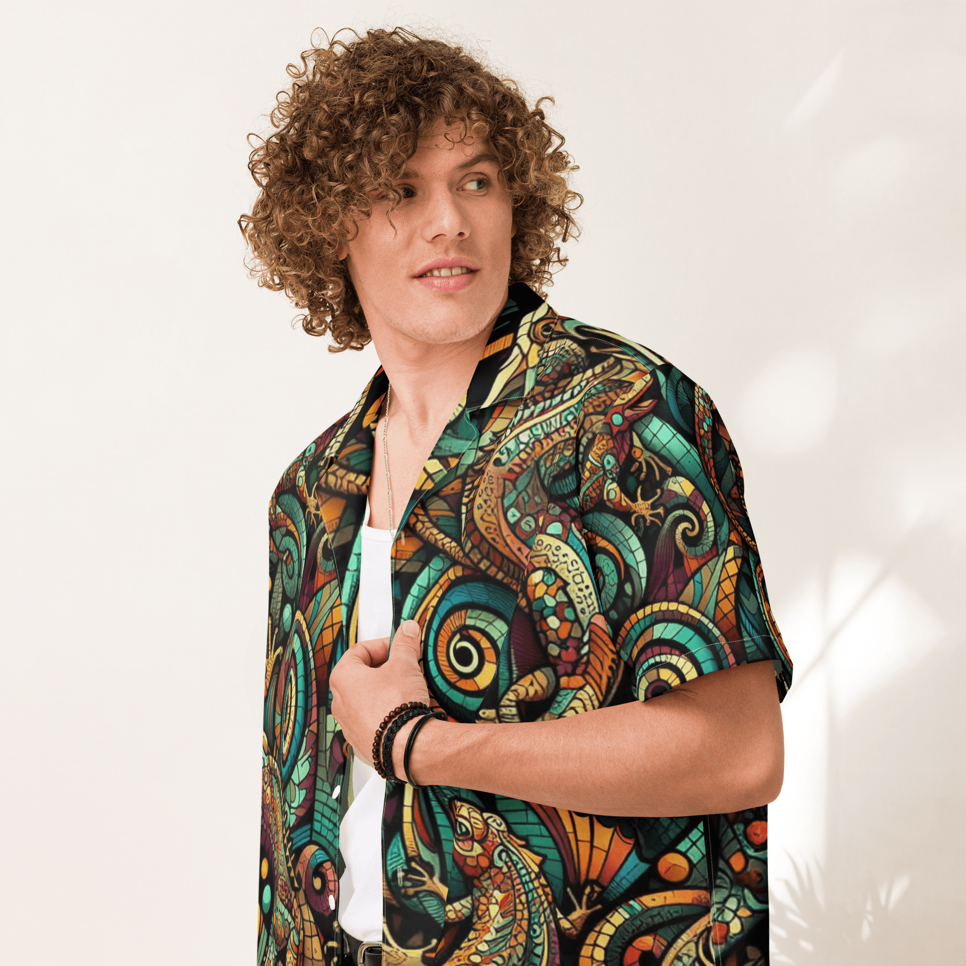 Dive into the whimsical world of "Gaudi Lizards" in our latest Hawaiian Shirt! 🌈 Inspired by the iconic Gaudi style, these lizards dance across the fabric in vibrant, mosaic-like patterns. 🎨 It's a fusion of artistry and tropical flair that'll make you stand out in any crowd. 🏝️👕 Embrace the spirit of Gaudi and let your style be as unique as you are! 🦎🌺