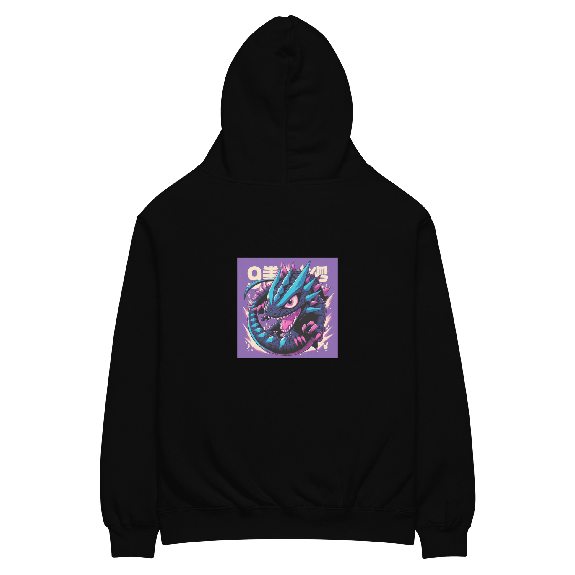 A sleek black hoodie with a 90s-style lizard glowing like Tokyo’s neon nights.